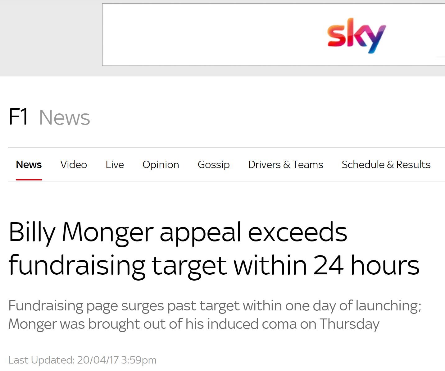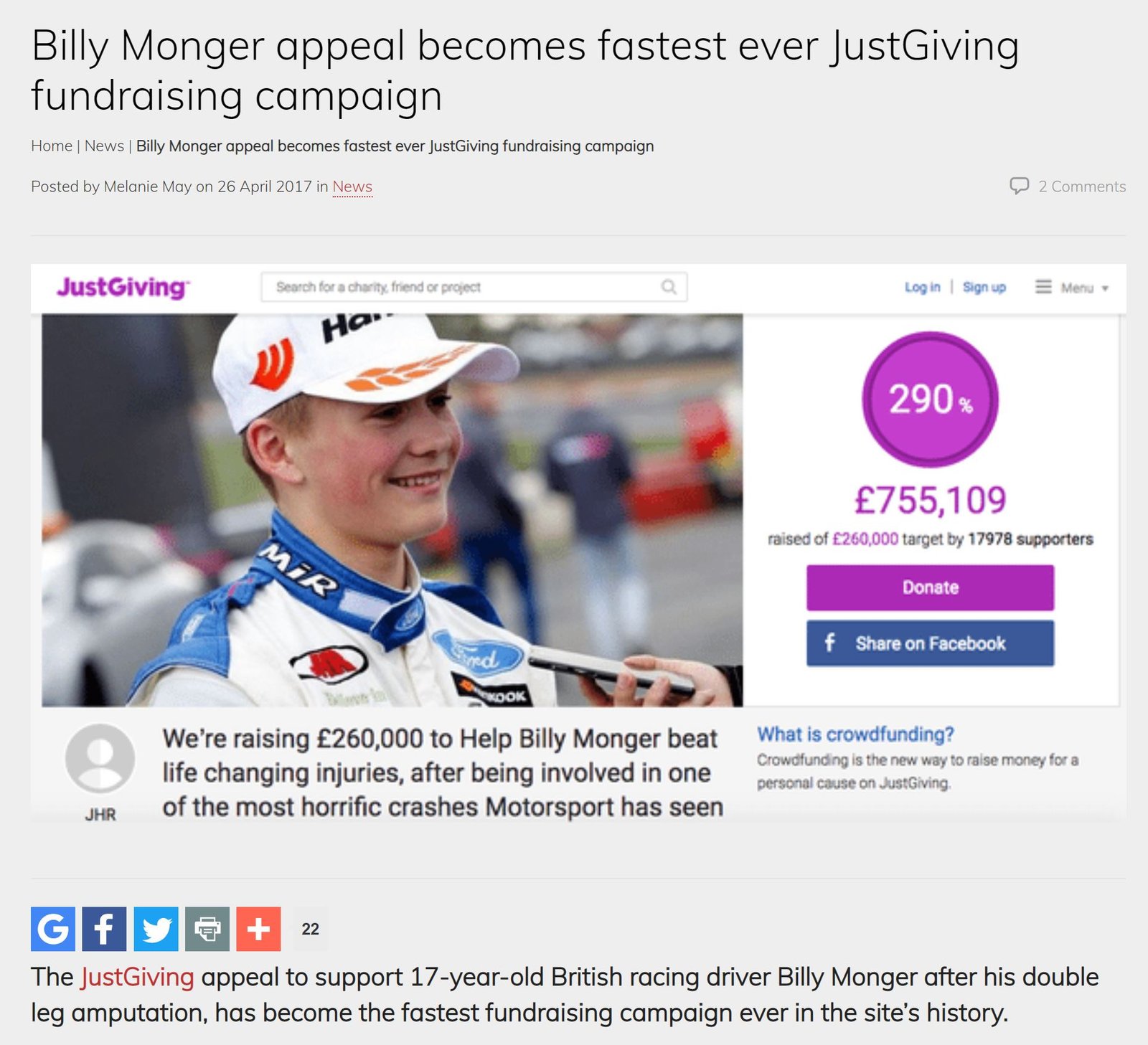 Billy Monger’s appeal became the fastest and the largest personal crowdfunding campaigns ever in the UK raising over £840,000