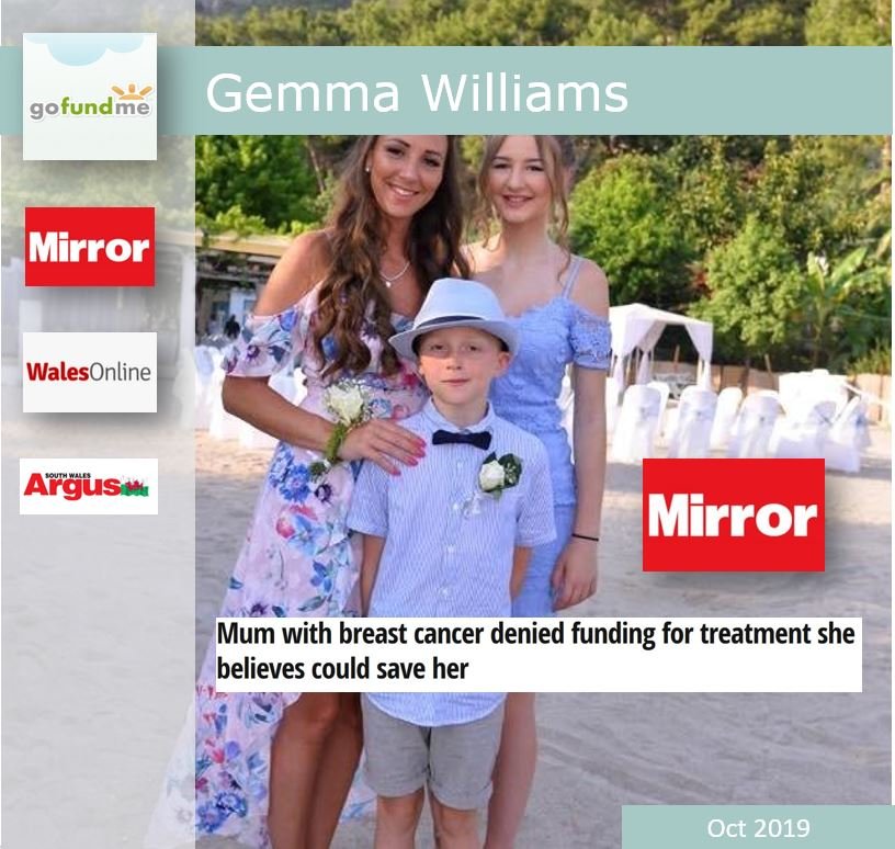 Gemma Williams, 35 year old mother of two, was diagnosed with breast cancer and discovered the NHS would not fund her lifesaving treatment.