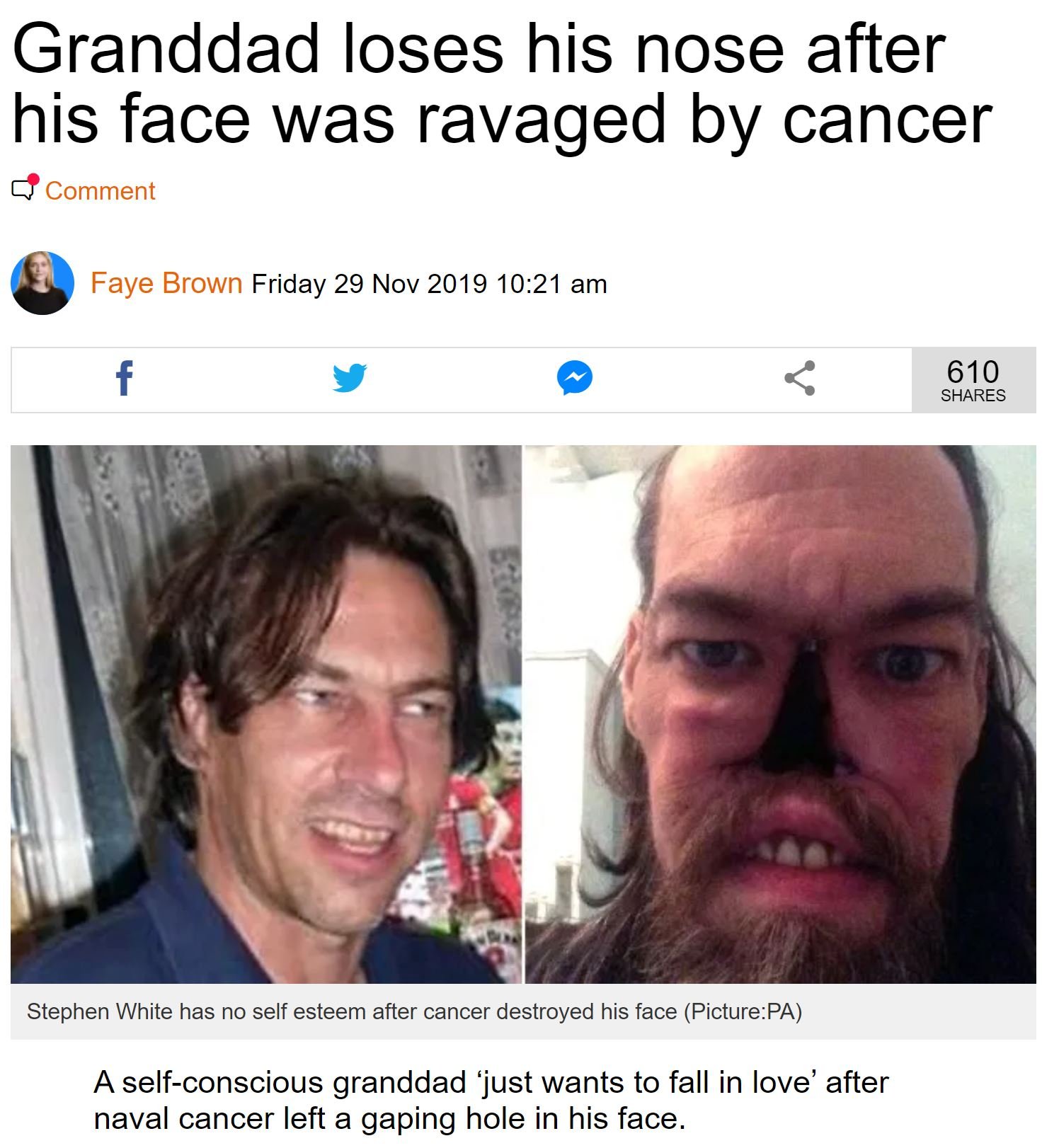 Stephen White sadly lost his nose to cancer and needed his eyes lasered and his teeth done after they were damaged during radiation treatment.