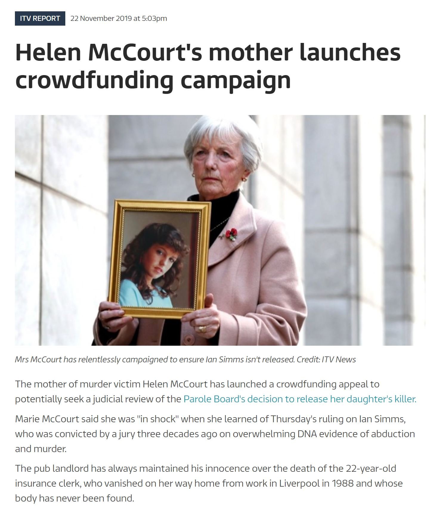 Mother of missing murder victim Helen McCourt who helped campaign for Helen’s Law (so that killers remain in prison until they reveal the location of their victim) was shocked to learn that a Parole Board recommended the release of her daughter’s killer Ian Simms.