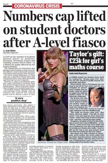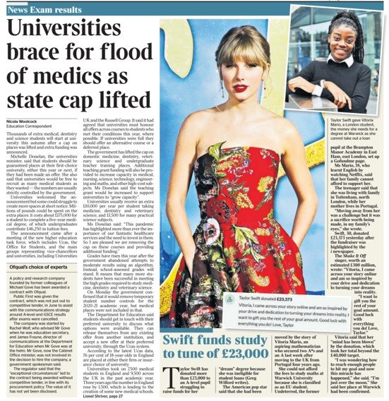 Taylor Swift donated over £23,000 to a young, gifted, and broke Tottenham teenager who had started a GoFundMe appeal to become a mathematician. On her appeal page, 18-year-old Vitoria Mario described herself as a ‘black girl with a dream’ and explained that despite being offered an unconditional place at Warwick to study mathematics, she was unable to afford to take it up.