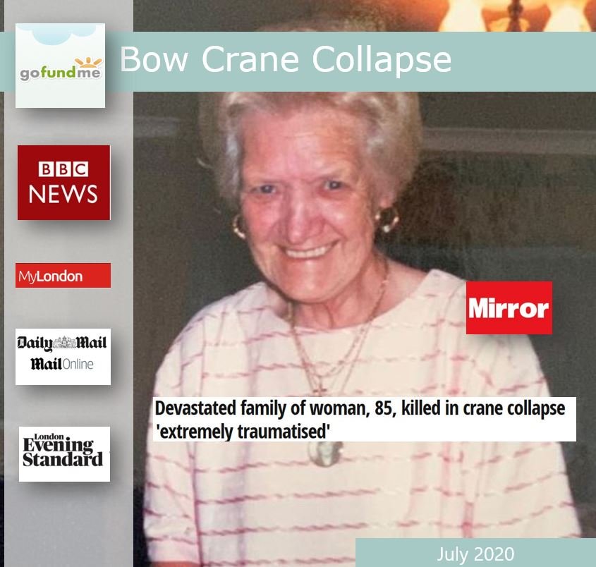 Appeal created by family of East London Bow Crane victim. 28-year-old Sam Atkinson managed to escape the building but his great aunt June Harvey (85) was killed in the tragic accident.