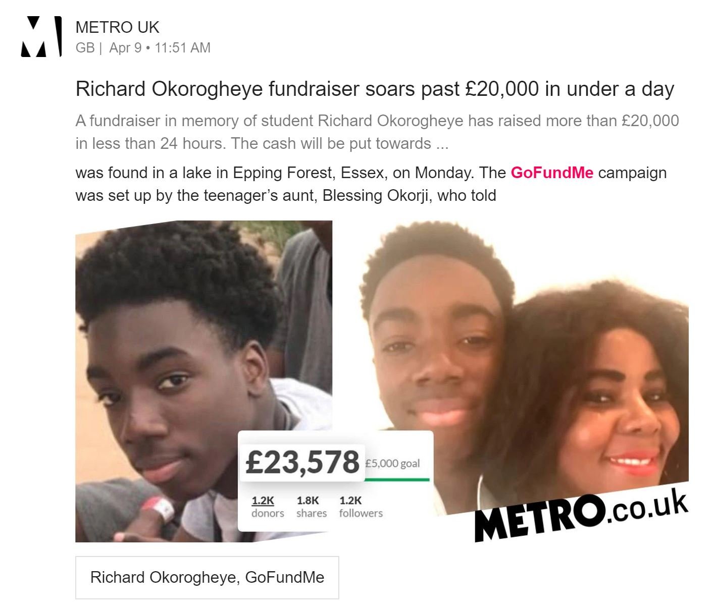 GoFundMe Appeal launched to help Richard Okorogheye’s mum after her son’s body was found a body in a lake in Epping Forest.