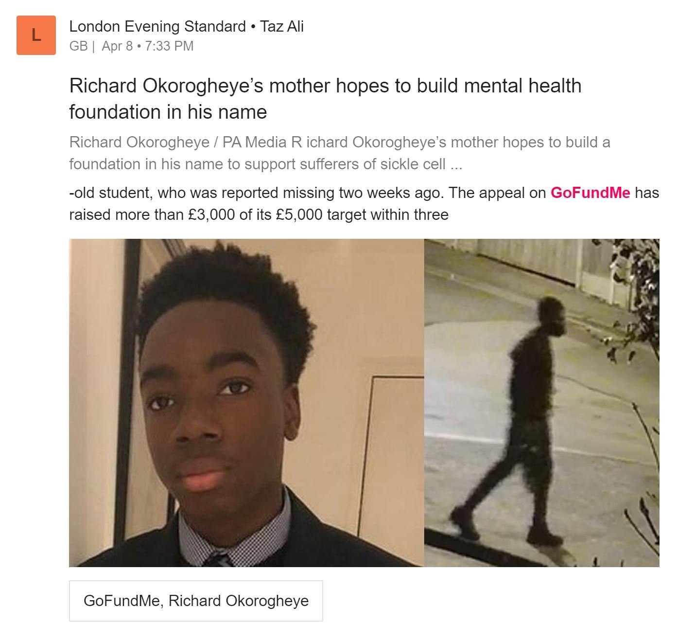 The official family memorial page launched by Richard Okorogheye’s Aunt after the 19-year-old, went missing from his home in Ladbroke Grove, west London, on 22 March. The student was found dead in Epping Forest, in Essex, two weeks later. His mother Joel now hopes to build a mental health foundation in his name.