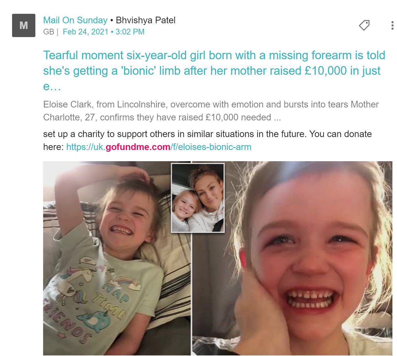 The family was delighted with the success of the appeal and little Eloise now has her bionic arm…