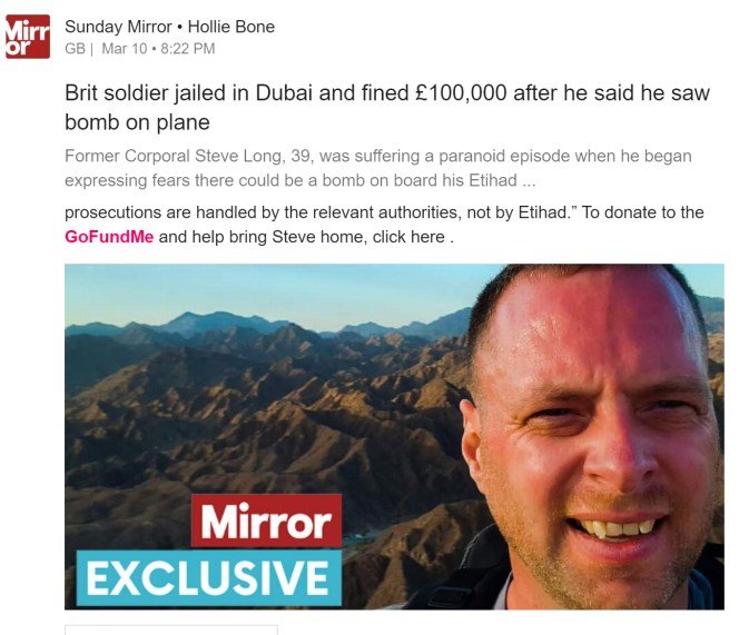 British soldier jailed in Dubai after he said he saw bomb on plane returns to UK…