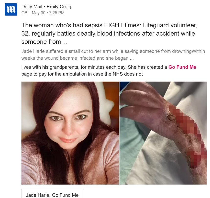 Jade Harle received the seemingly-small injury in a heroic rescue mission, but the small scratch turned into a gruesome open wound and now she’s desperate to have her arm amputated and replaced with a prosthetic.
