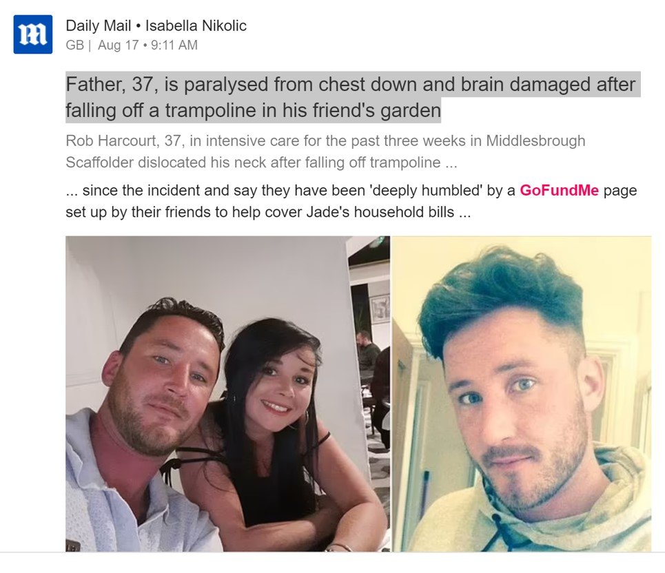 Rob Harcourt sustained “catastrophic” injuries after he tripped and fell into a trampoline at a friend’s house. The freak accident led to the 37-year-old from Stockton, Durham, suffering a dislocated neck and kinked spinal cord.